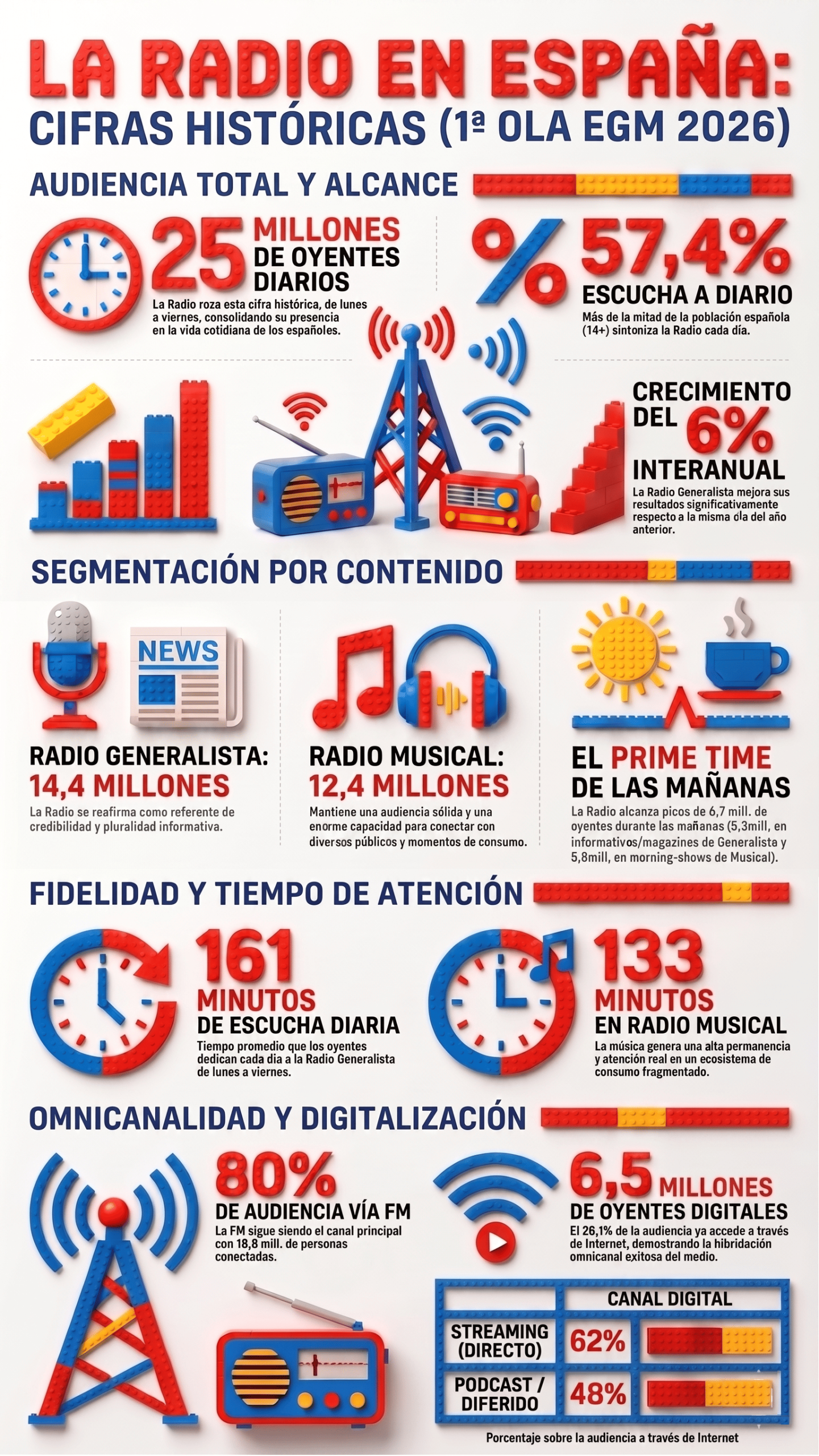 Tras la publicación de la 1ª ola del EGM de 2026, la Radio vuelve a confirmar su extraordinario momento en España. Roza ya los 25 millones de oyentes diarios de lunes a viernes, impulsada especialmente por el hecho de que la Radio Generalista supera los 14 millones (14,4 mill.) de oyentes diarios.