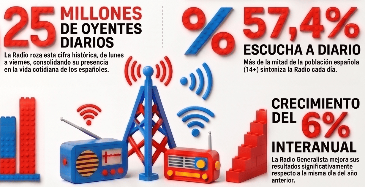 En conjunto, estas cifras sitúan la escucha diaria de Radio en el 57,4% de la población mayor de 14 años de lunes a viernes. Pocas plataformas de comunicación pueden acreditar una presencia cotidiana tan sólida, tan transversal y tan integrada en la vida diaria de millones de personas.