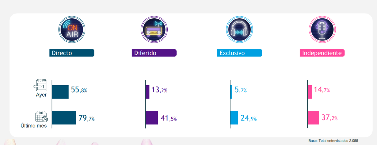 La tecnología y la digitalización tan acelerada de los últimos años ha afectado a todos los sectores, la radio también ha tenido que hacer frente a una nueva realidad. Según el último estudio de IMOP Insights “Una mirada a la audiencia en el nuevo ecosistema de audio”, la radio en directo domina el ecosistema de audio, con un 80% de individuos que la consumen mensualmente frente al 41% que declara hacerlo en diferido . La radio sigue siendo el principal proveedor de contenido.