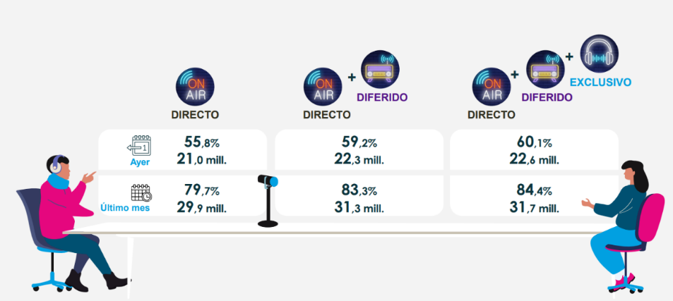 - La radio musical, sigue creciendo, llegando a los 21 millones de oyentes mensuales.